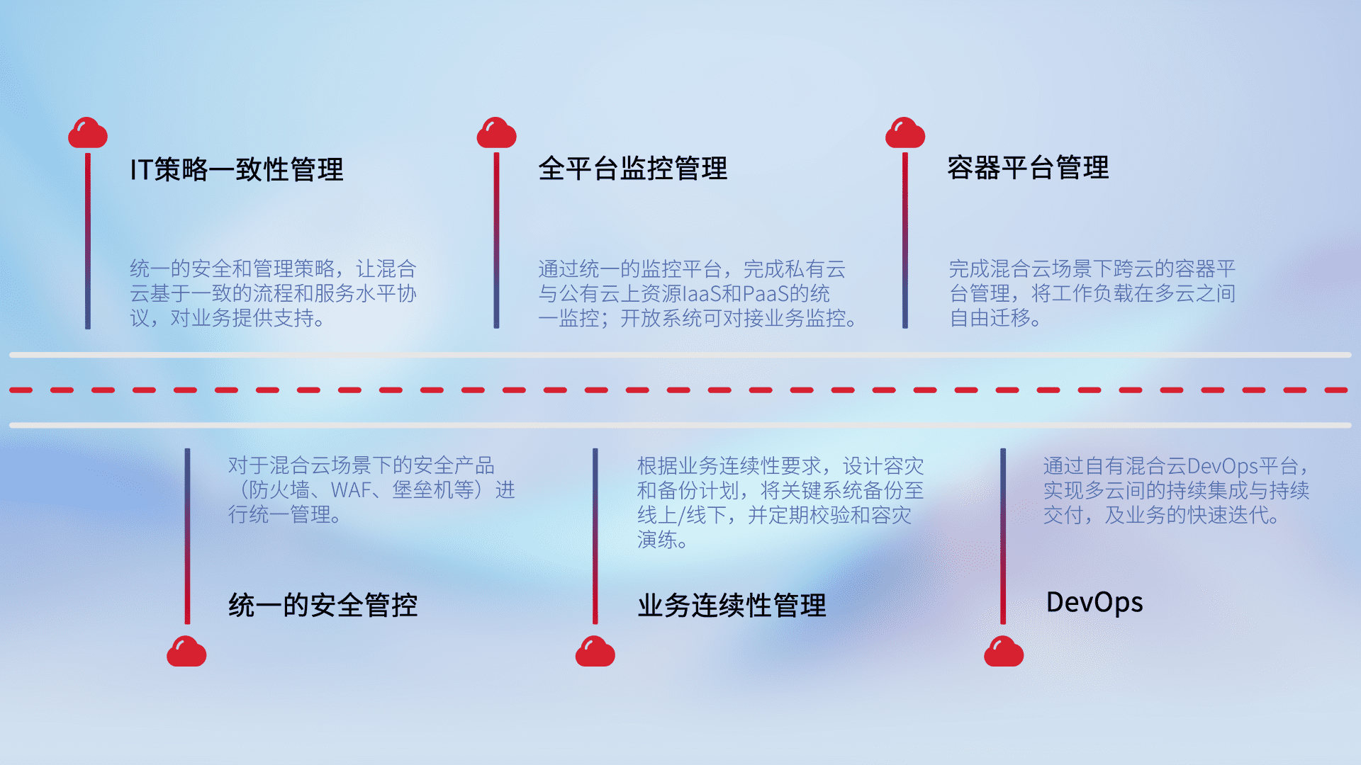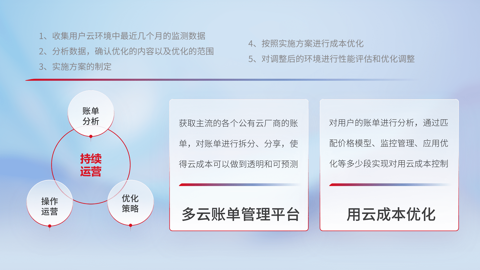 通过多云纳管,,,以统一的资源数据模型把客户的云资源进行抽象和封装,,进而实现对多云资源的统一操作,,,,保障云资源管理的可靠性、、稳定性与可用性。。量身定制化运维内容,,配置、、、、开发运维、、、补丁管理、、、、备份、、监控、、认证和访问管理、、、、审计和日常巡检等,,,,保障在用云过程中的可靠度,,稳定度以及高可用率。。
