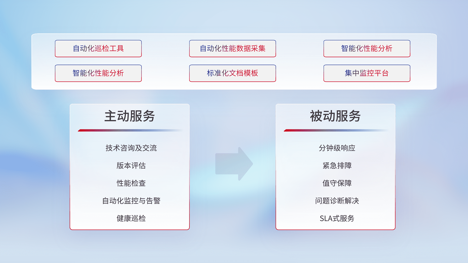 智能化工具和标准化文档,,,,保障服务质量,,,,提供主动服务(包含技术咨询、、版本评估、、、、性能检查、、、、自动化监控与告警、、、、健康巡检)和被动服务包含(分钟级响应、、、、紧急排障、、、值守保障、、、、问题诊断解决、、、SLA服务)。。